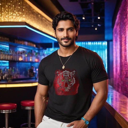 SILVER & RED SPANGLE ROYAL Bengal Tiger - Unisex Round Neck Regular Fit 100% Combed Cotton Half Sleeve T-Shirt
