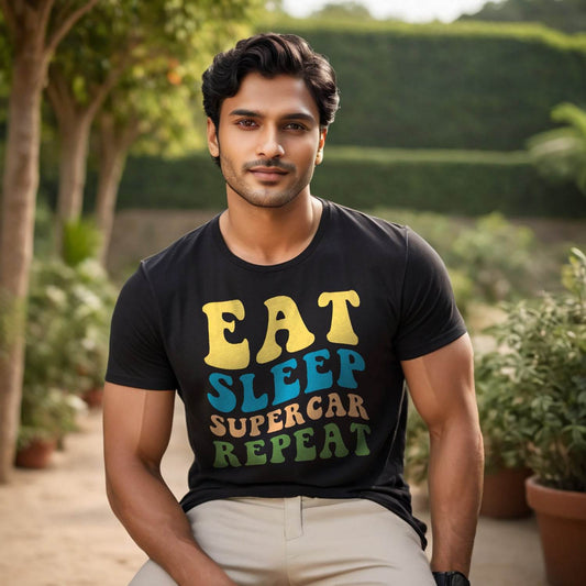 EAT SLLEP SUPER CAR REPEAT - Unisex Round Neck Regular Fit 100% Combed Cotton Half Sleeve T-Shirt