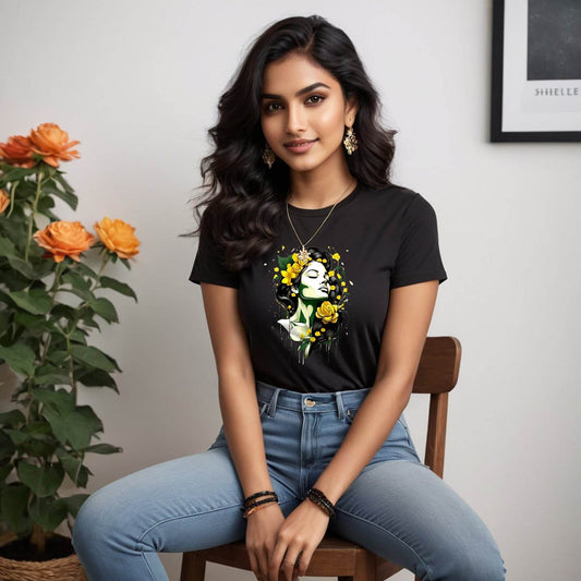 Woman with flowers art - Unisex Round Neck Regular Fit 100% Combed Cotton Half Sleeve T-Shirt