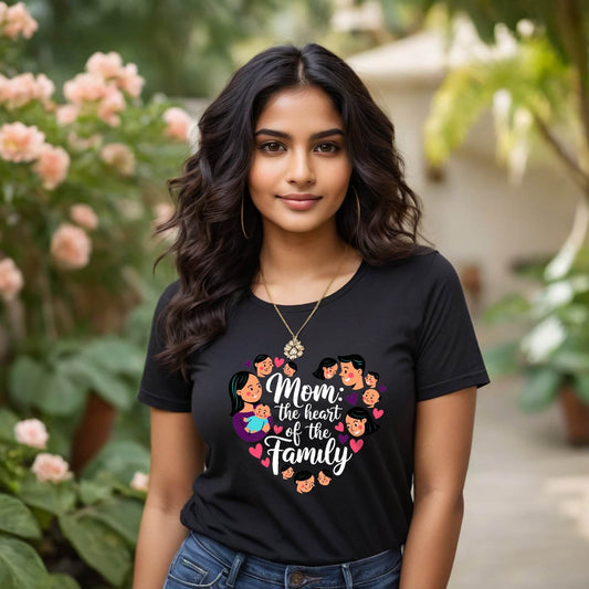 Mom the heart of the Family Print- Unisex Round Neck Regular Fit 100% Combed Cotton Half Sleeve T-Shirt