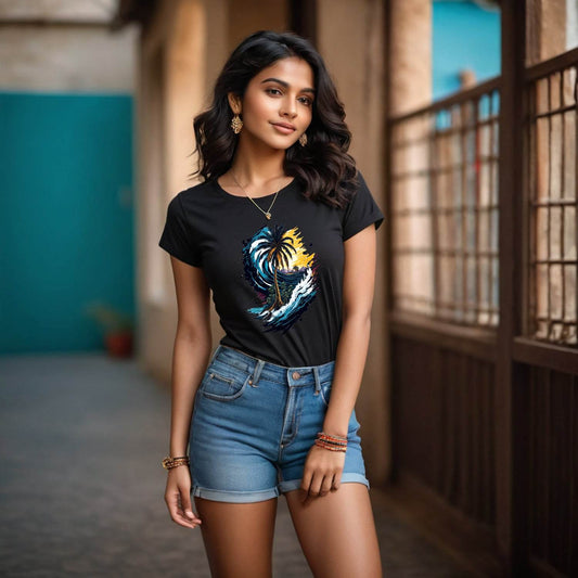 Artistic Palm Tree And Mountain - Unisex Round Neck Regular Fit 100% Combed Cotton Half Sleeve T-Shirt