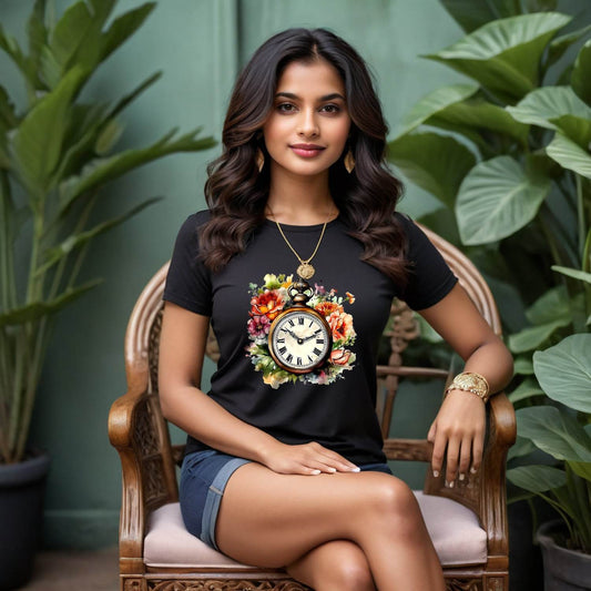 Clock Flowers - Unisex Round Neck Regular Fit 100% Combed Cotton Half Sleeve T-Shirt