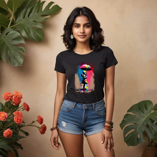 Umbrella Girl Rainbow Rain - Unisex Round Neck Regular Fit 100% Combed Cotton Half Sleeve T-Shirt
