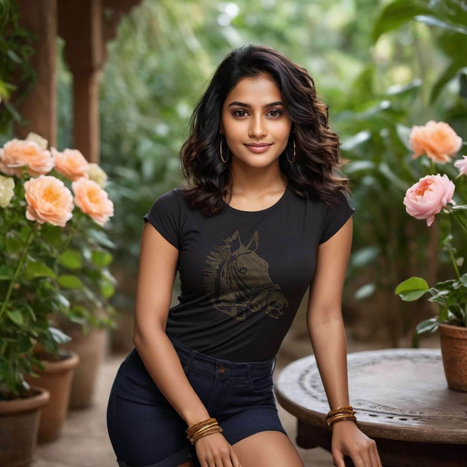 Pair the GOLD SPANGLE HORSE with jeans, and shorts, or even layer it with a jacket it complements every style effortlessly. -